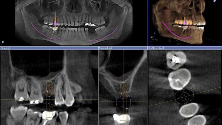 Трехмерная модель зубочелюстной системы, которая позволяет очень точно определить состояние зубов, размер и плотность кости, провести любые необходимые измерения. Данный вид исследования необходим как при сложном эндодонтическом лечении, так и при имплантации.