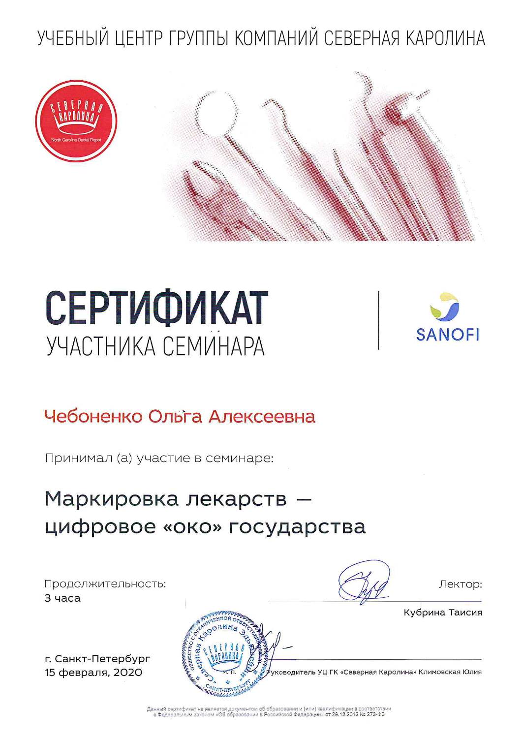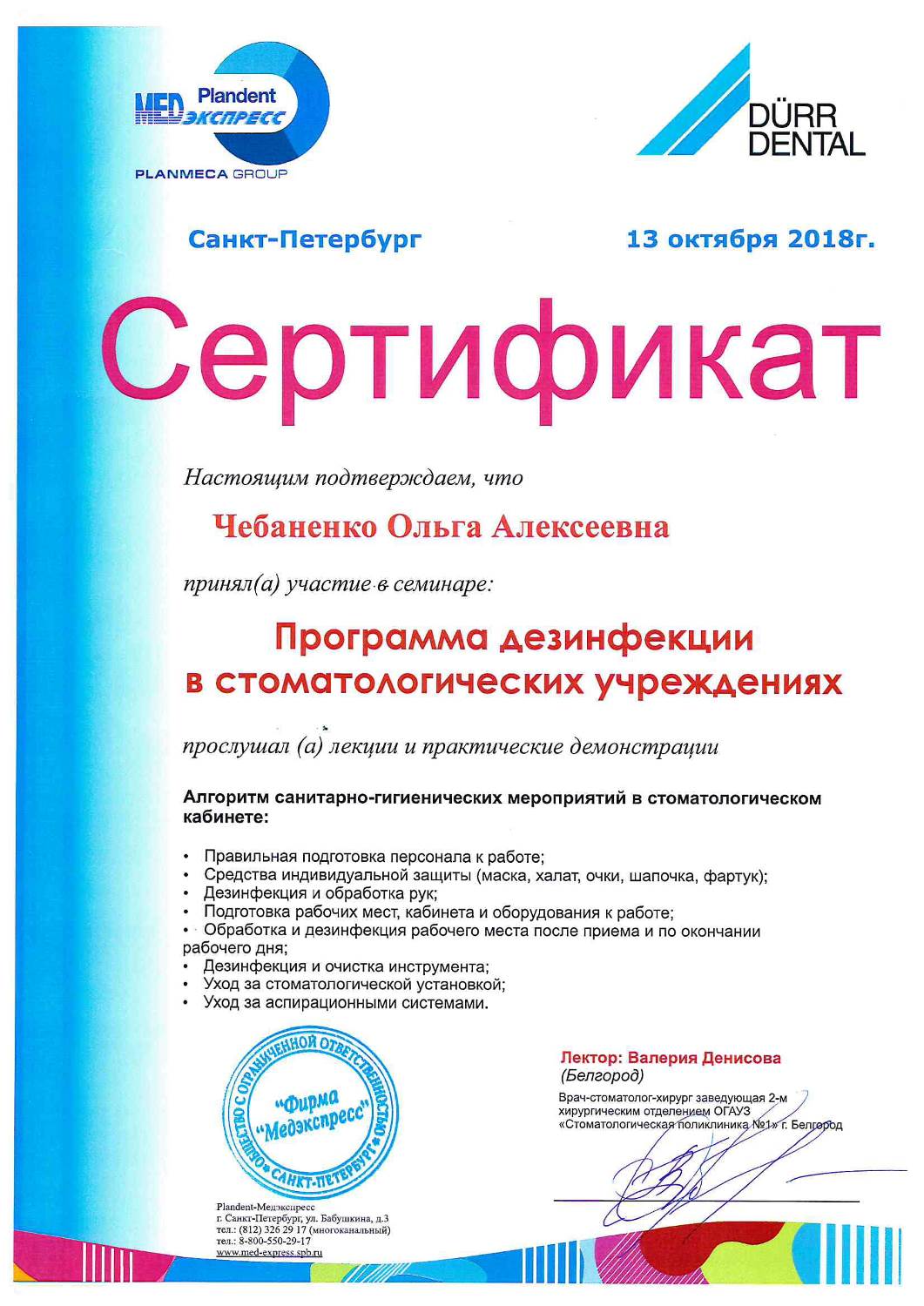 В 2018 году приняла участие в семинаре «Программа дезинфекции в стоматологических учреждениях» и прослушала лекции и практические демонстрации «Алгоритм санитарно-гигиенических мероприятий в стоматологическом кабинете».