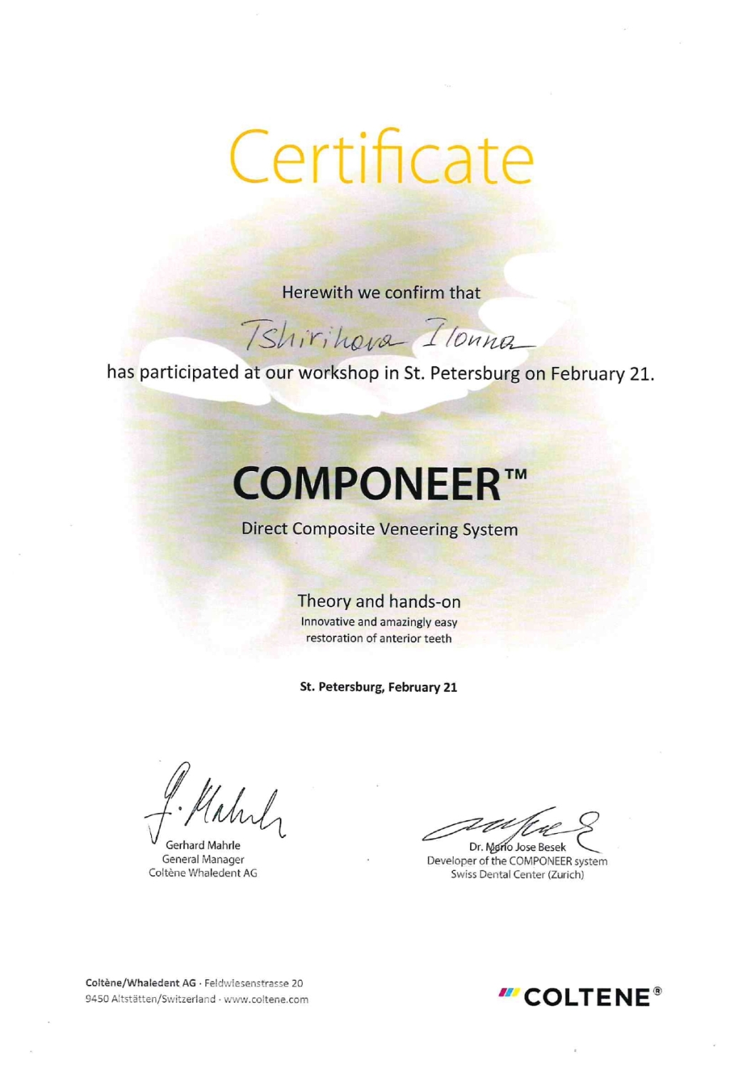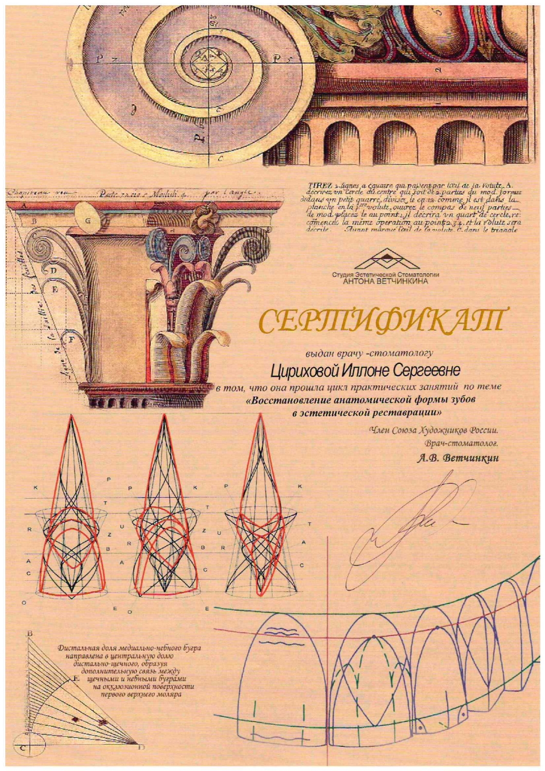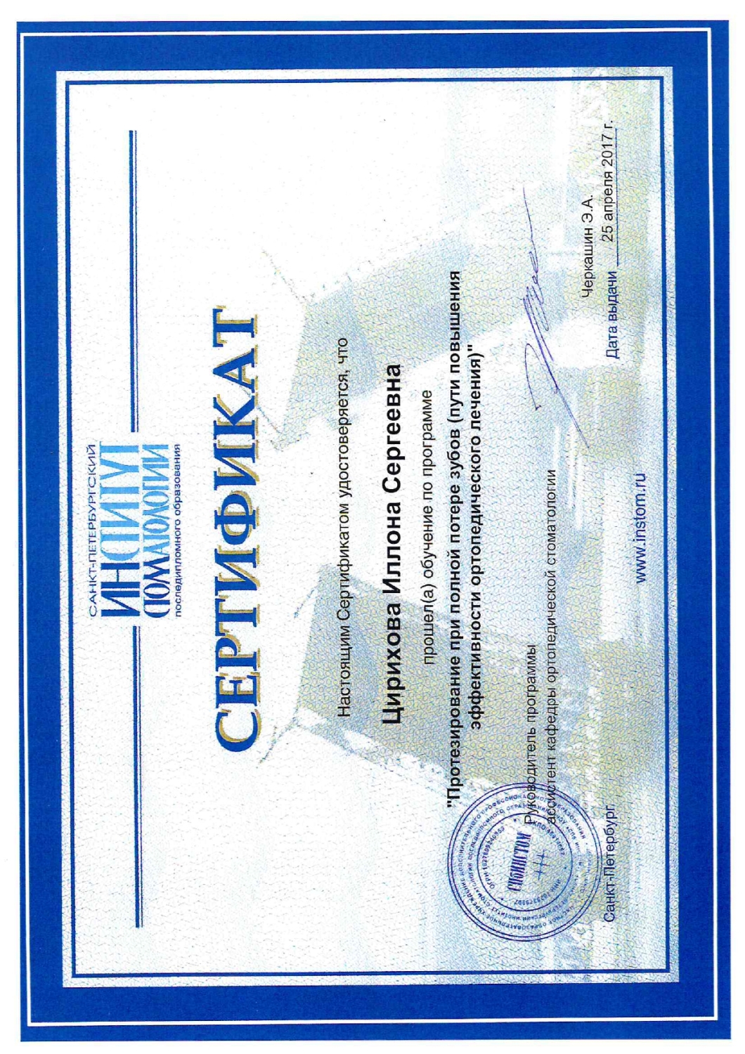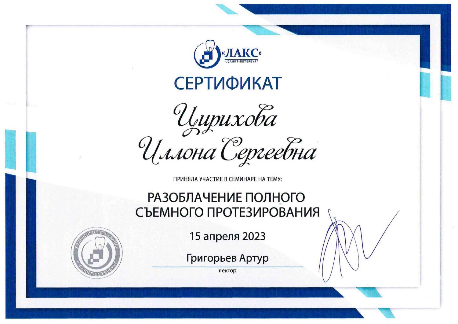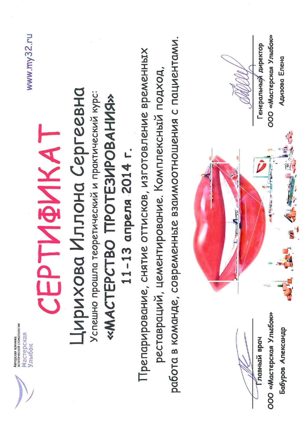 Цирихова И.С. постоянно совершенствует свое мастерство, использует передовые препараты и методы лечения, посещает семинары и участвует во всевозможных конференциях и выставках по лечению и протезированию.