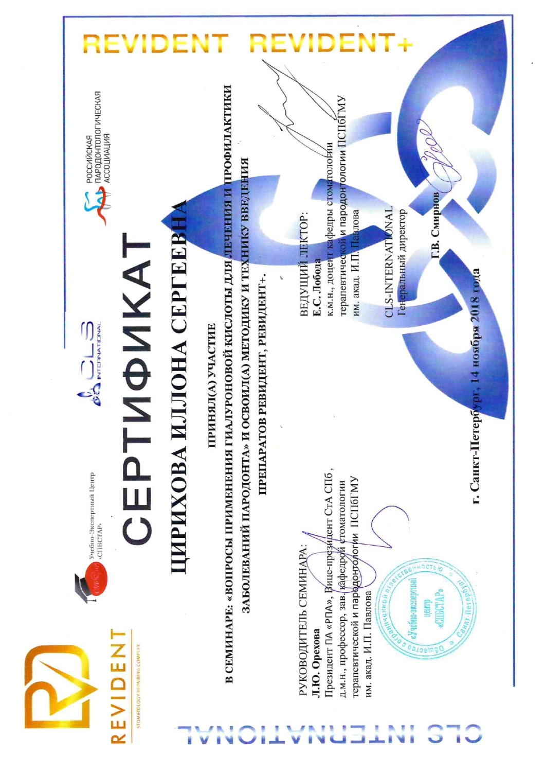 Далее, в 2004-2006 году Иллона Сергеевна проходила обучение в клинической ординатуре в Медицинском факультете Санкт-Петербургского государственного университета по специальности – Стоматология и ей была присвоена специальность- «Врач-стоматолог».