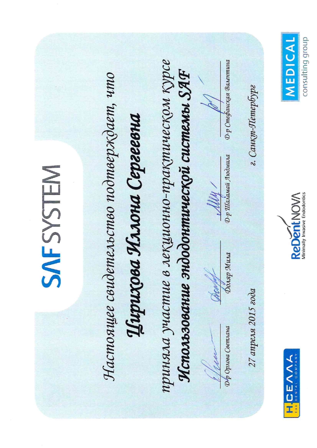 Затем в 2015 году она прошла переподготовку в государственном бюджетном образовательном учреждении высшего профессионального образования «Северо-Западный государственный медицинском университете им. И.И. Мечникова» Министерства здравоохранения Российской Федерации по программе «Стоматология ортопедическая».